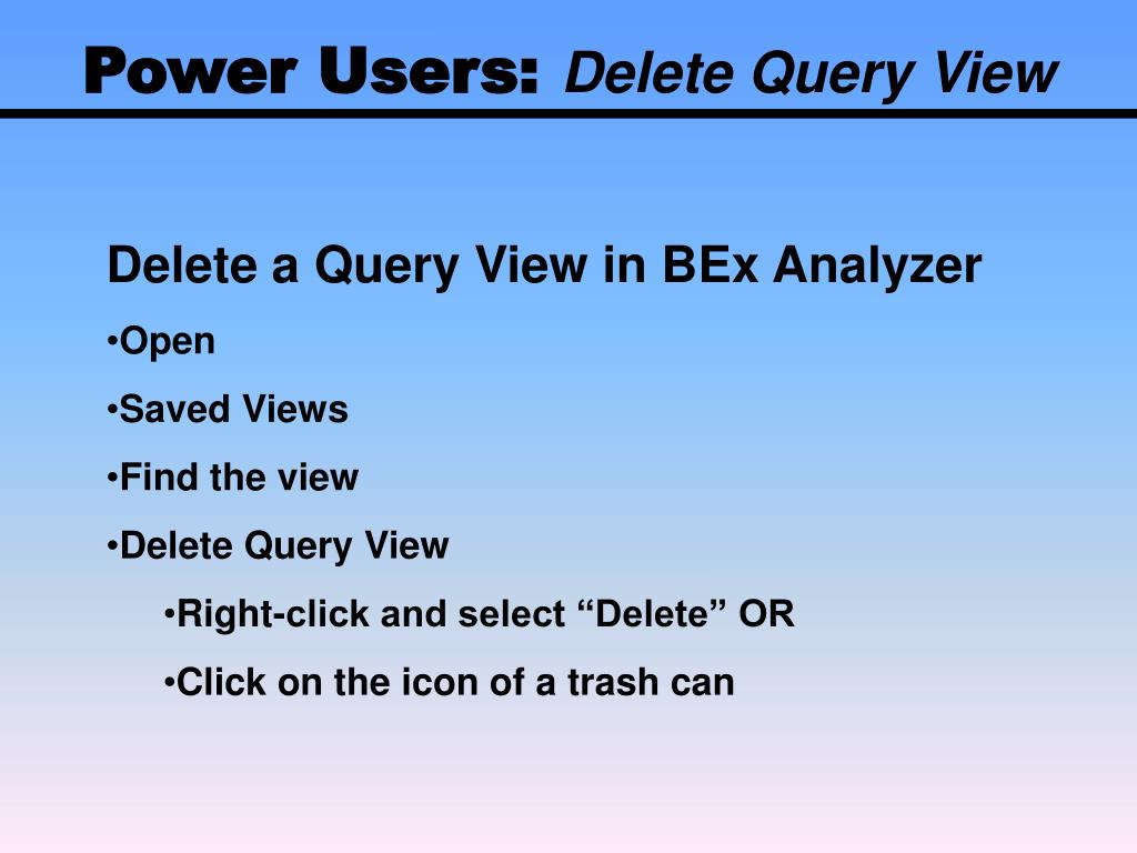 Power Users: Delete Query View • Delete a Query View in BEx Analyzer • Open • Saved Views • Find the view • Delete Query View • Right-click and select “Delete” OR • Click on the icon of a trash can
