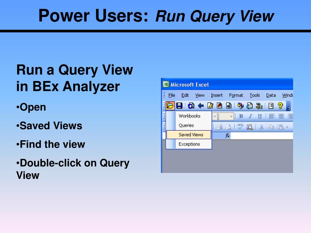 Power Users:Run Query View • Run a Query View in BEx Analyzer • Open • Saved Views • Find the view • Double-click on Query View