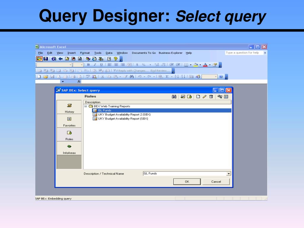 Open BEx Analyzer: Toolbar • Open • Workbooks – Not available using portal/AD authentication • Queries – Collection of a selection of characteristics and key figures (InfoObjects) for the analysis of the data in an InfoProvider. • Saved Views – The saved changes made to a query view. • Exceptions - Not available