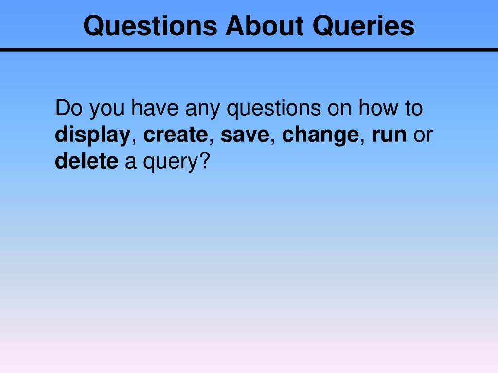 Questions About Queries Do you have any questions on how to display, create, save, change, run or delete a query?