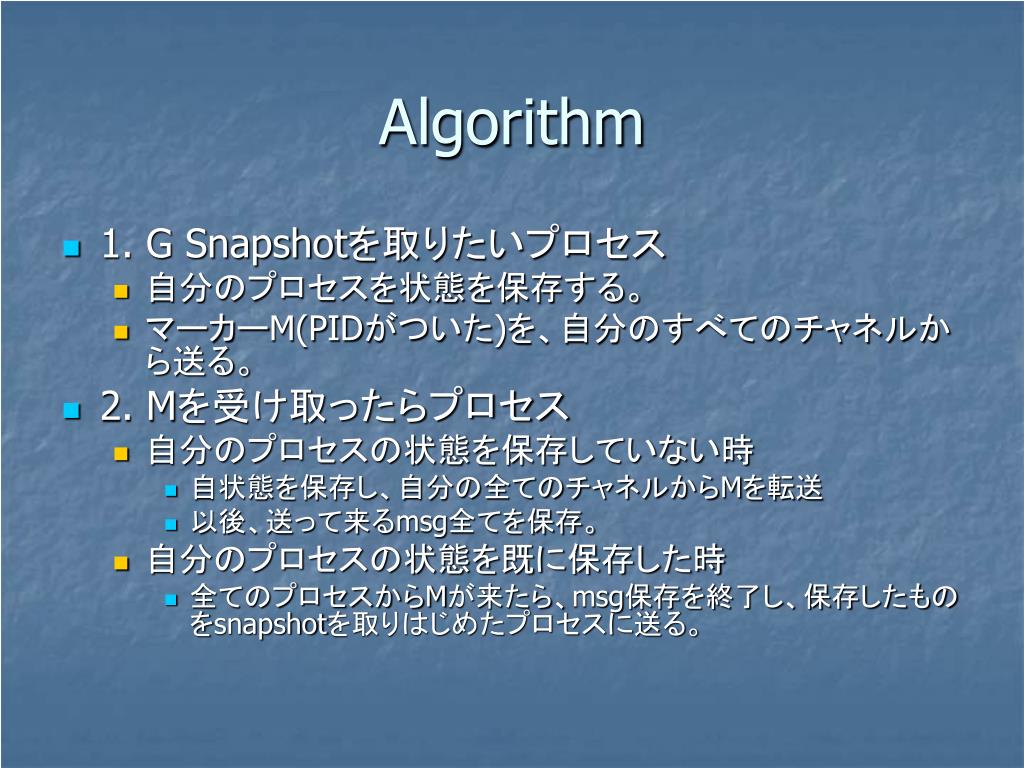 Algorithm • 1. G Snapshotを取りたいプロセス • 自分のプロセスを状態を保存する。 • マーカーM(PIDがついた)を、自分のすべてのチャネルから送る。 • 2. Mを受け取ったらプロセス • 自分のプロセスの状態を保存していない時 • 自状態を保存し、自分の全てのチャネルからMを転送 • 以後、送って来るmsg全てを保存。 • 自分のプロセスの状態を既に保存した時 • 全てのプロセスからMが来たら、msg保存を終了し、保存したものをsnapshotを取りはじめたプロセスに送る。