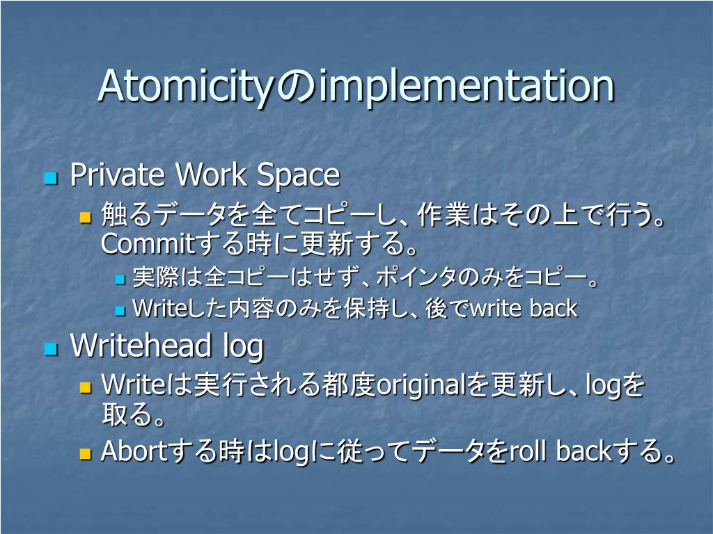 Atomicityのimplementation • Private Work Space • 触るデータを全てコピーし、作業はその上で行う。Commitする時に更新する。 • 実際は全コピーはせず、ポインタのみをコピー。 • Writeした内容のみを保持し、後でwrite back • Writehead log • Writeは実行される都度originalを更新し、logを取る。 • Abortする時はlogに従ってデータをroll backする。