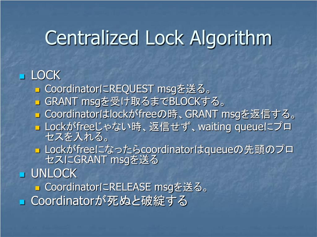 Centralized Lock Algorithm • LOCK • CoordinatorにREQUEST msgを送る。 • GRANT msgを受け取るまでBLOCKする。 • Coordinatorはlockがfreeの時、GRANT msgを返信する。 • Lockがfreeじゃない時、返信せず、waiting queueにプロセスを入れる。 • Lockがfreeになったらcoordinatorはqueueの先頭のプロセスにGRANT msgを送る • UNLOCK • CoordinatorにRELEASE msgを送る。 • Coordinatorが死ぬと破綻する
