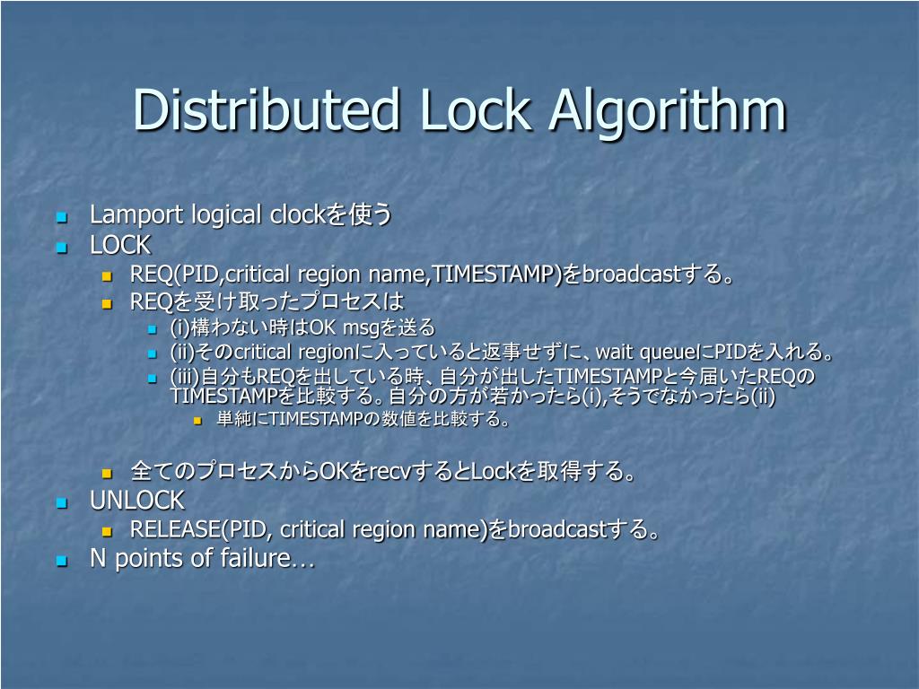 Distributed Lock Algorithm • Lamport logical clockを使う • LOCK • REQ(PID,critical region name,TIMESTAMP)をbroadcastする。 • REQを受け取ったプロセスは • (i)構わない時はOK msgを送る • (ii)そのcritical regionに入っていると返事せずに、wait queueにPIDを入れる。 • (iii)自分もREQを出している時、自分が出したTIMESTAMPと今届いたREQのTIMESTAMPを比較する。自分の方が若かったら(i),そうでなかったら(ii) • 単純にTIMESTAMPの数値を比較する。 • 全てのプロセスからOKをrecvするとLockを取得する。 • UNLOCK • RELEASE(PID, critical region name)をbroadcastする。 • N points of failure…