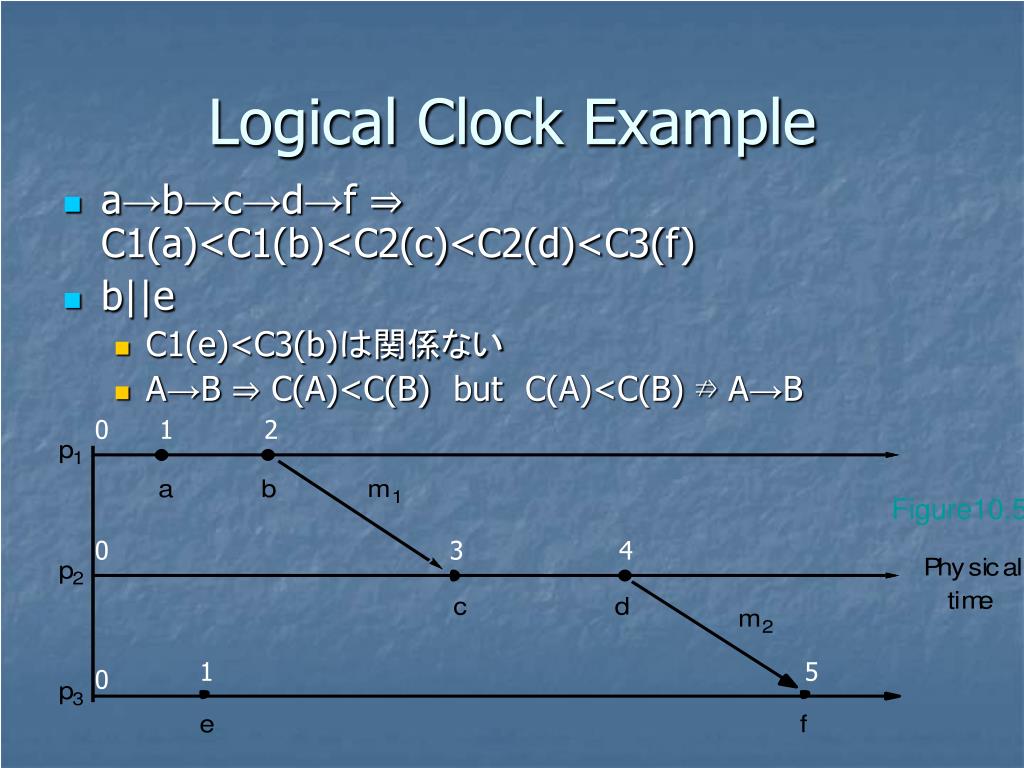 0 Figure10.5 0 0 Logical Clock Example • a→b→c→d→f ⇒ C1(a)<C1(b)<C2(c)<C2(d)<C3(f) • b||e • C1(e)<C3(b)は関係ない • A→B ⇒ C(A)<C(B)butC(A)<C(B) ⇏ A→B 1 2 3 4 1 5