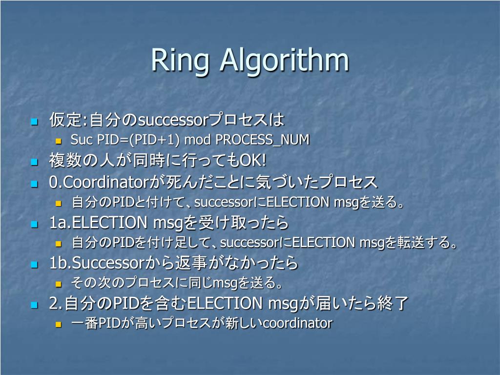 Ring Algorithm • 仮定:自分のsuccessorプロセスは • Suc PID=(PID+1) mod PROCESS_NUM • 複数の人が同時に行ってもOK! • 0.Coordinatorが死んだことに気づいたプロセス • 自分のPIDと付けて、successorにELECTION msgを送る。 • 1a.ELECTION msgを受け取ったら • 自分のPIDを付け足して、successorにELECTION msgを転送する。 • 1b.Successorから返事がなかったら • その次のプロセスに同じmsgを送る。 • 2.自分のPIDを含むELECTION msgが届いたら終了 • 一番PIDが高いプロセスが新しいcoordinator