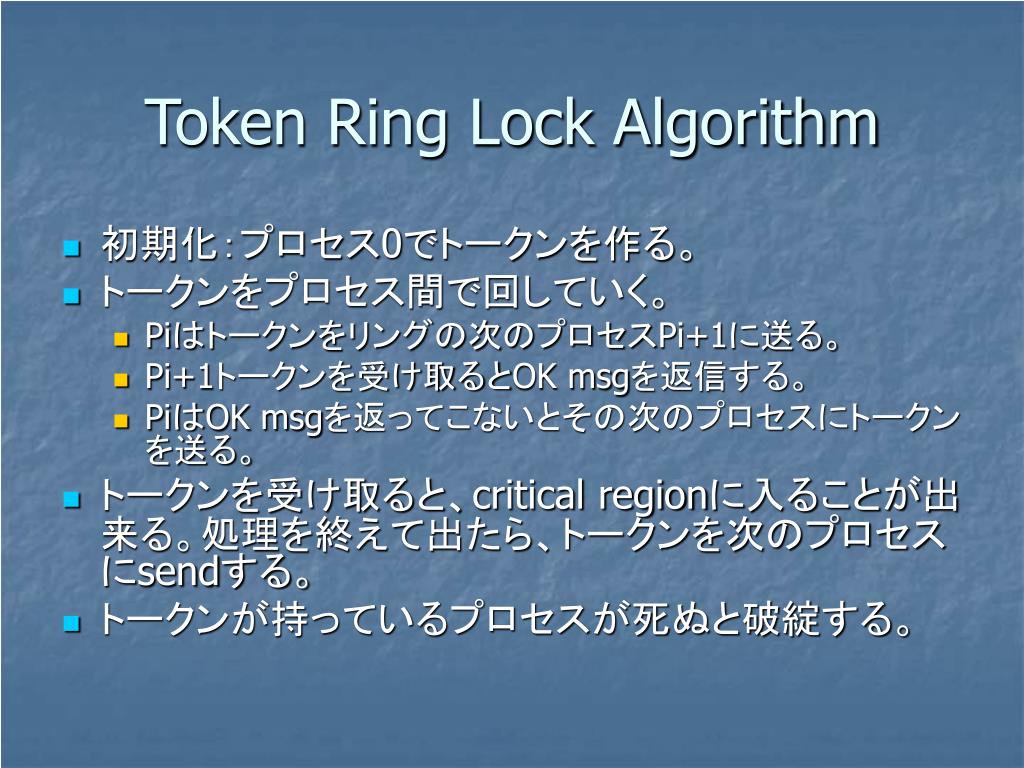 Token Ring Lock Algorithm • 初期化:プロセス0でトークンを作る。 • トークンをプロセス間で回していく。 • Piはトークンをリングの次のプロセスPi+1に送る。 • Pi+1トークンを受け取るとOK msgを返信する。 • PiはOK msgを返ってこないとその次のプロセスにトークンを送る。 • トークンを受け取ると、critical regionに入ることが出来る。処理を終えて出たら、トークンを次のプロセスにsendする。 • トークンが持っているプロセスが死ぬと破綻する。