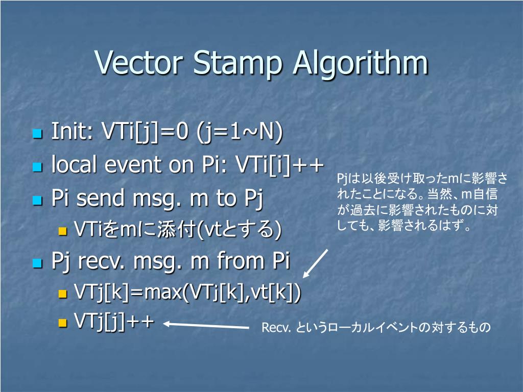 Pjは以後受け取ったmに影響されたことになる。当然、m自信が過去に影響されたものに対しても、影響されるはず。Pjは以後受け取ったmに影響されたことになる。当然、m自信が過去に影響されたものに対しても、影響されるはず。 Recv. というローカルイベントの対するもの Vector Stamp Algorithm • Init: VTi[j]=0 (j=1~N) • local event on Pi: VTi[i]++ • Pi send msg. m to Pj • VTiをmに添付(vtとする) • Pj recv. msg. m from Pi • VTj[k]=max(VTj[k],vt[k]) • VTj[j]++