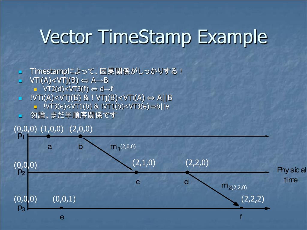 (0,0,0) (0,0,0) (0,0,0) Vector TimeStamp Example • Timestampによって、因果関係がしっかりする! • VTi(A)<VTj(B) ⇔ A→B • VT2(d)<VT3(f) ⇔ d→f • !VTi(A)<VTj(B) & ! VTj(B)<VTi(A) ⇔ A||B • !VT3(e)<VT1(b) & !VT1(b)<VT3(e)⇔b||e • 勿論、まだ半順序関係です (1,0,0) (2,0,0) (2,0,0) (2,1,0) (2,2,0) (2,2,0) (0,0,1) (2,2,2)