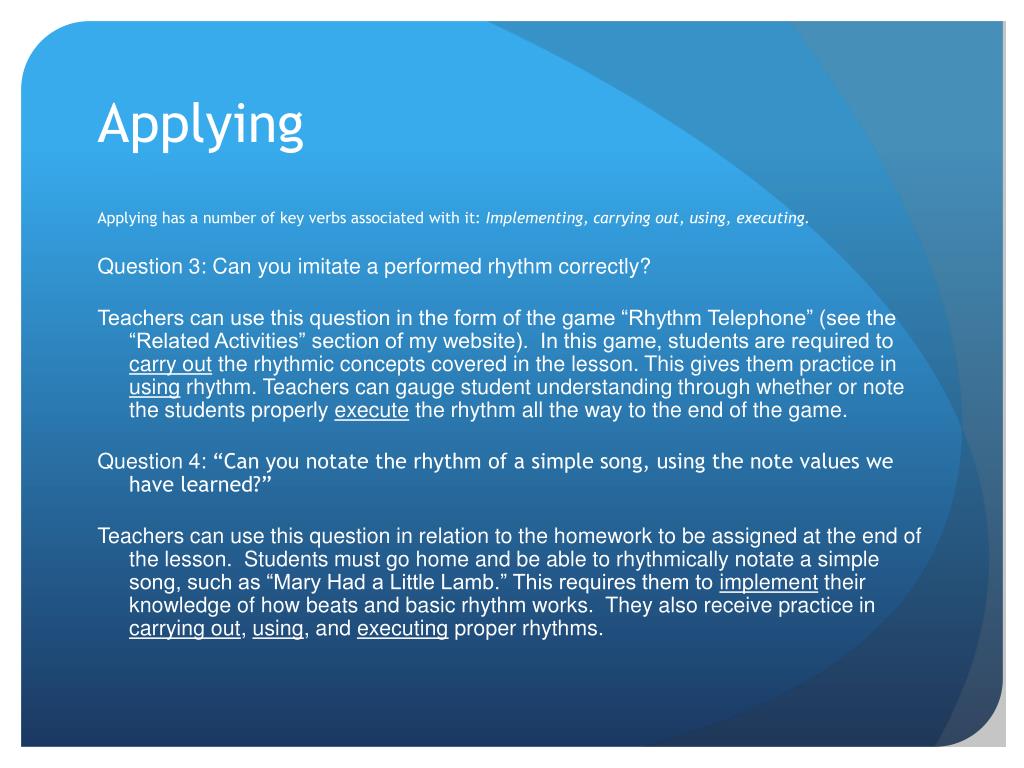 Applying Applying has a number of key verbs associated with it: Implementing, carrying out, using, executing. Question 3: Can you imitate a performed rhythm correctly? Teachers can use this question in the form of the game “Rhythm Telephone” (see the “Related Activities” section of my website). In this game, students are required to carry out the rhythmic concepts covered in the lesson. This gives them practice in using rhythm. Teachers can gauge student understanding through whether or note the students properly execute the rhythm all the way to the end of the game. Question 4: “Can you notate the rhythm of a simple song, using the note values we have learned?” Teachers can use this question in relation to the homework to be assigned at the end of the lesson. Students must go home and be able to rhythmically notate a simple song, such as “Mary Had a Little Lamb.” This requires them to implement their knowledge of how beats and basic rhythm works. They also receive practice in carrying out, using, and executing proper rhythms.