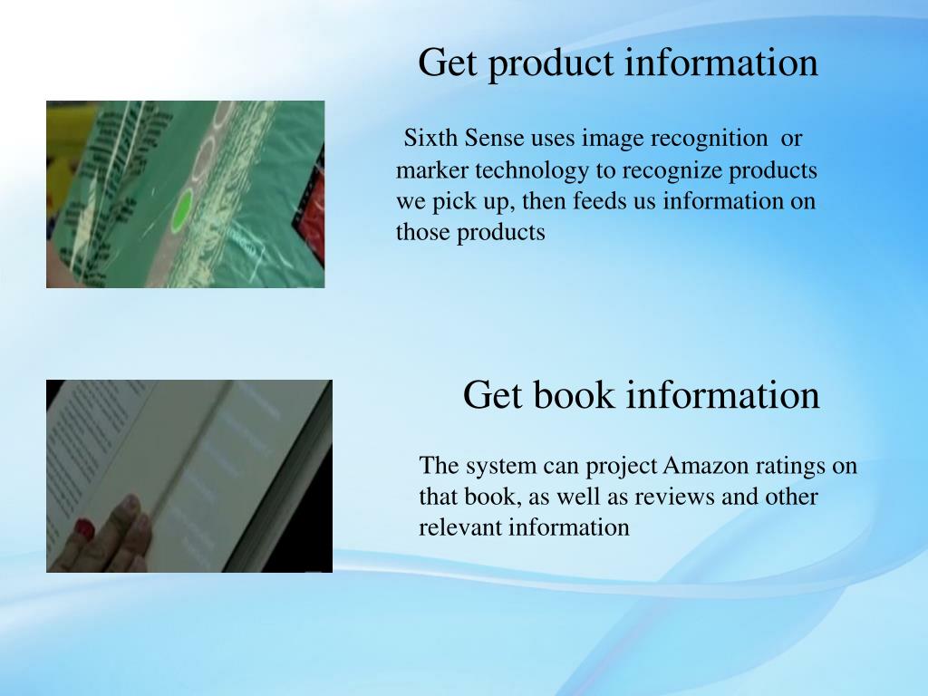 Get product information Sixth Sense uses image recognition or marker technology to recognize products we pick up, then feeds us information on those products Get book information The system can project Amazon ratings on that book, as well as reviews and other relevant information