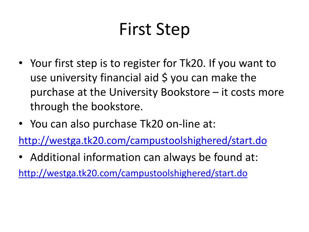 First Step • Your first step is to register for Tk20. If you want to use university financial aid $ you can make the purchase at the University Bookstore – it costs more through the bookstore. • You can also purchase Tk20 on-line at: http://westga.tk20.com/campustoolshighered/start.do • Additional information can always be found at: http://westga.tk20.com/campustoolshighered/start.do