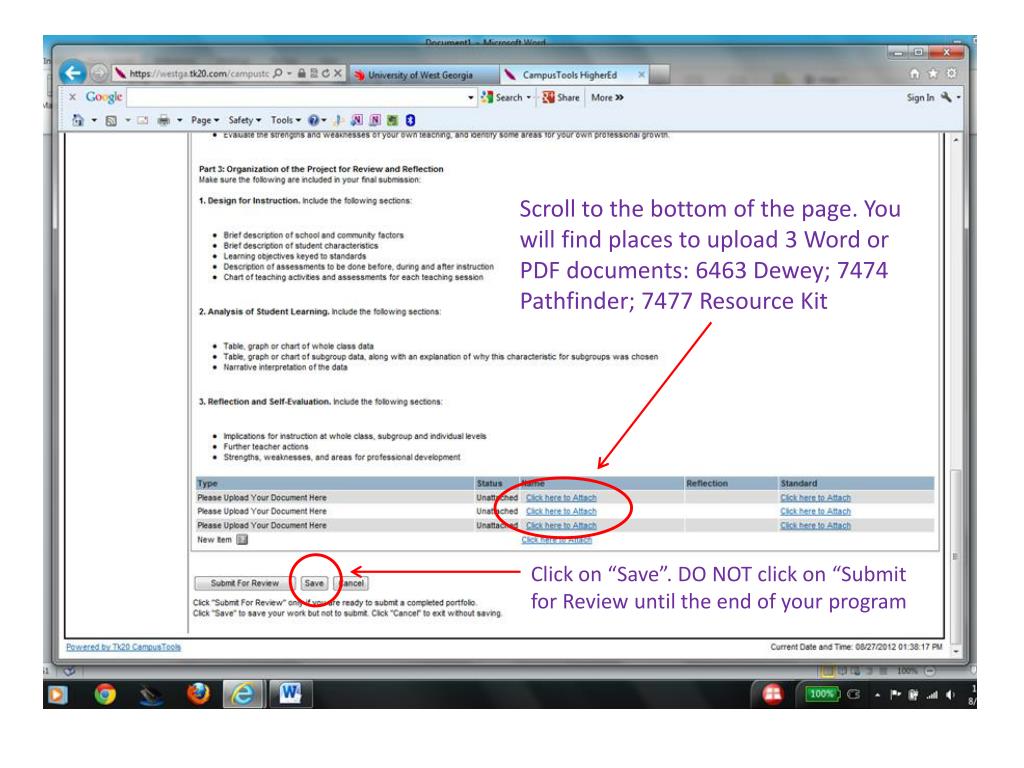 Scroll to the bottom of the page. You will find places to upload 3 Word or PDF documents: 6463 Dewey; 7474 Pathfinder; 7477 Resource Kit Click on “Save”. DO NOT click on “Submit for Review until the end of your program