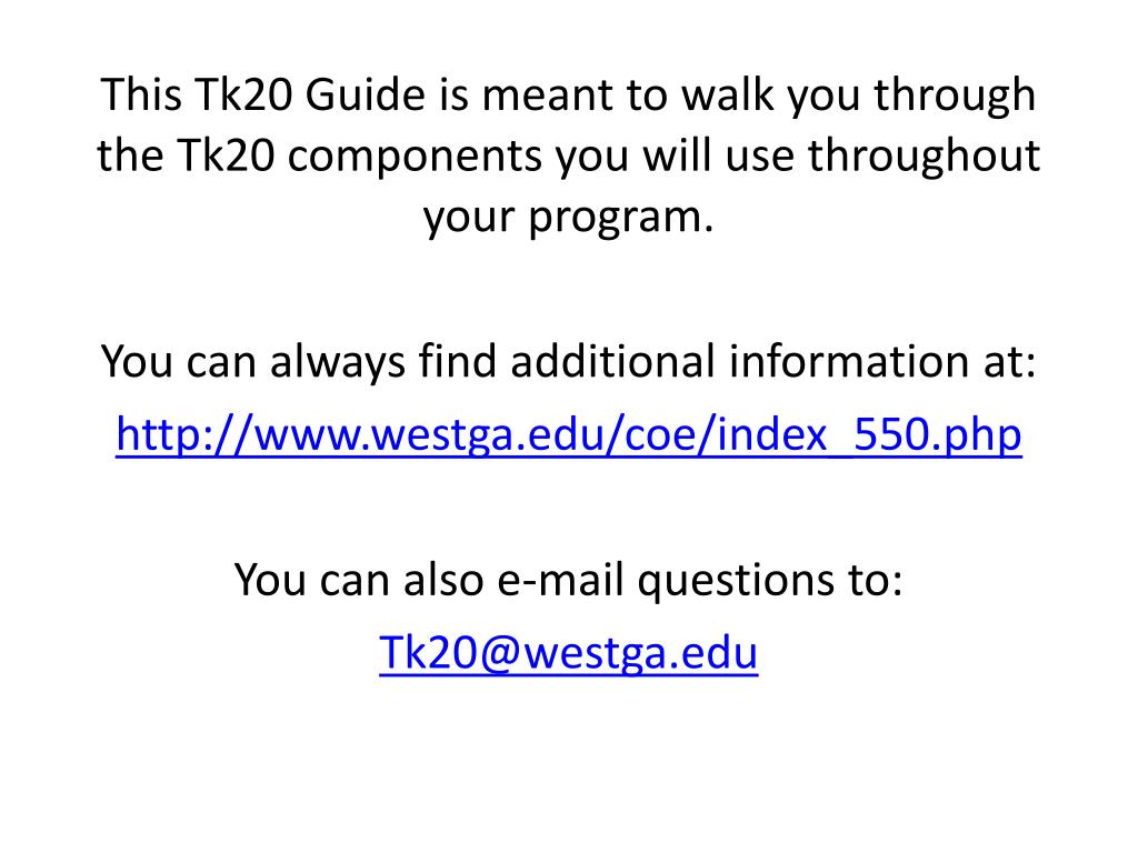 This Tk20 Guide is meant to walk you through the Tk20 components you will use throughout your program. You can always find additional information at: http://www.westga.edu/coe/index_550.php You can also e-mail questions to: Tk20@westga.edu