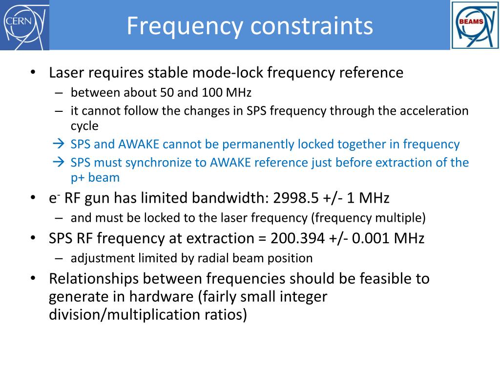 Frequency constraints • Laser requires stable mode-lock frequency reference • between about 50 and 100 MHz • it cannot follow the changes in SPS frequency through the acceleration cycle • SPS and AWAKE cannot be permanently locked together in frequency • SPS must synchronize to AWAKE reference just before extraction of the p+ beam • e- RF gun has limited bandwidth: 2998.5 +/- 1 MHz • and must be locked to the laser frequency (frequency multiple) • SPS RF frequency at extraction = 200.394 +/- 0.001 MHz • adjustment limited by radial beam position • Relationships between frequencies should be feasible to generate in hardware (fairly small integer division/multiplication ratios)