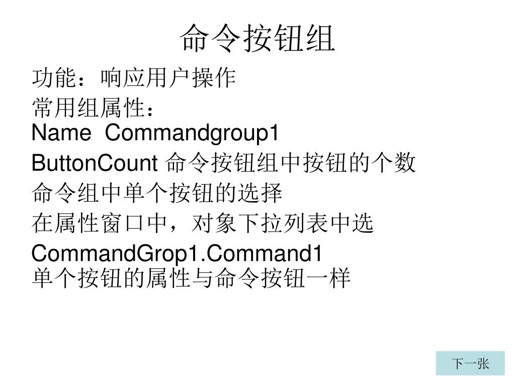 命令按钮组 功能:响应用户操作 常用组属性:Name Commandgroup1 ButtonCount 命令按钮组中按钮的个数 命令组中单个按钮的选择 在属性窗口中,对象下拉列表中选 CommandGrop1.Command1单个按钮的属性与命令按钮一样 下一张