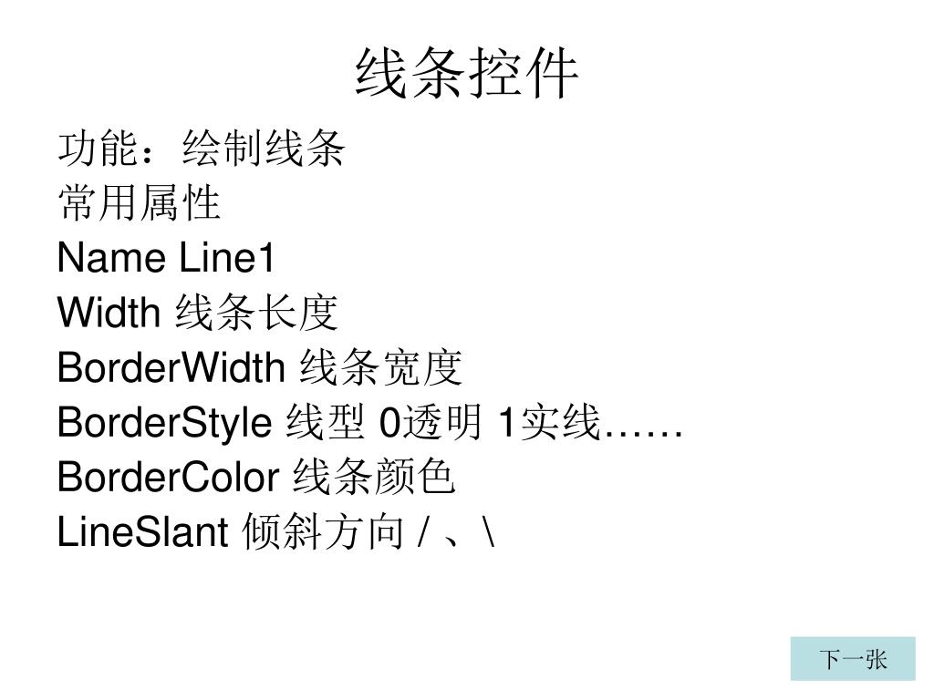 线条控件 功能:绘制线条 常用属性 Name Line1 Width 线条长度 BorderWidth 线条宽度 BorderStyle 线型 0透明 1实线…… BorderColor 线条颜色 LineSlant 倾斜方向 / 、\ 下一张