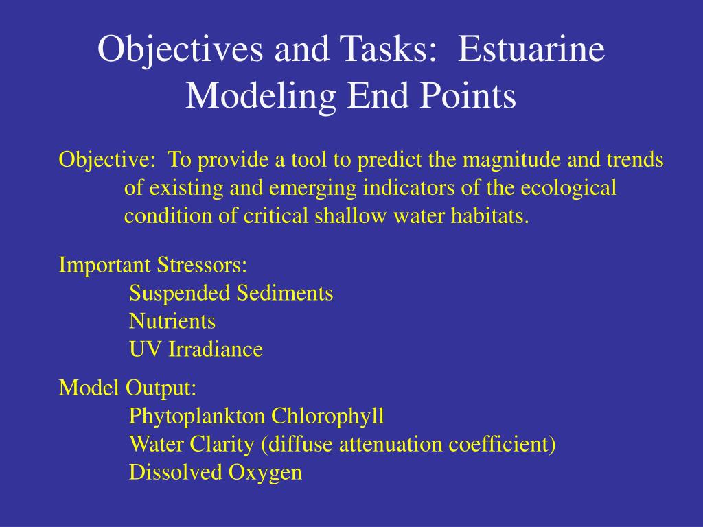 Objectives and Tasks: Estuarine Modeling End Points Objective: To provide a tool to predict the magnitude and trends of existing and emerging indicators of the ecological condition of critical shallow water habitats. Important Stressors: Suspended Sediments Nutrients UV Irradiance Model Output: Phytoplankton Chlorophyll Water Clarity (diffuse attenuation coefficient) Dissolved Oxygen