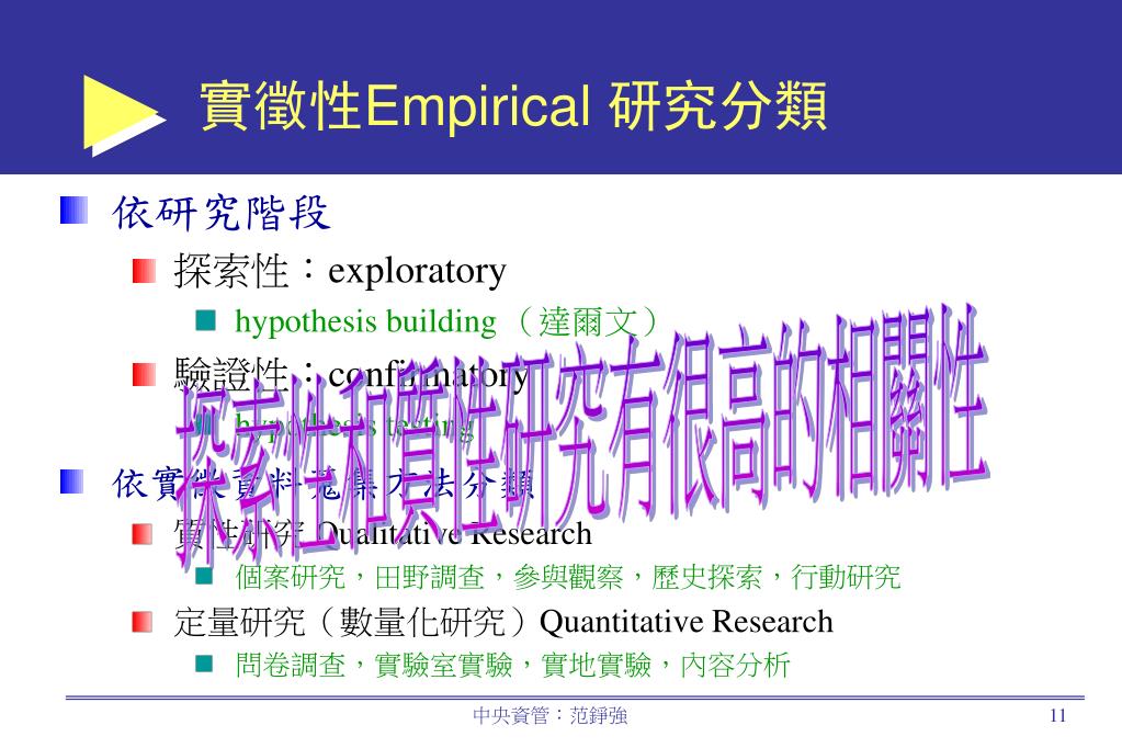 實徵性Empirical 研究分類 • 依研究階段 • 探索性:exploratory • hypothesis building (達爾文) • 驗證性:confirmatory • hypothesis testing • 依實徵資料蒐集方法分類 • 質性研究 Qualitative Research • 個案研究,田野調查,參與觀察,歷史探索,行動研究 • 定量研究(數量化研究)Quantitative Research • 問卷調查,實驗室實驗,實地實驗,內容分析 探索性和質性研究有很高的相關性 中央資管:范錚強