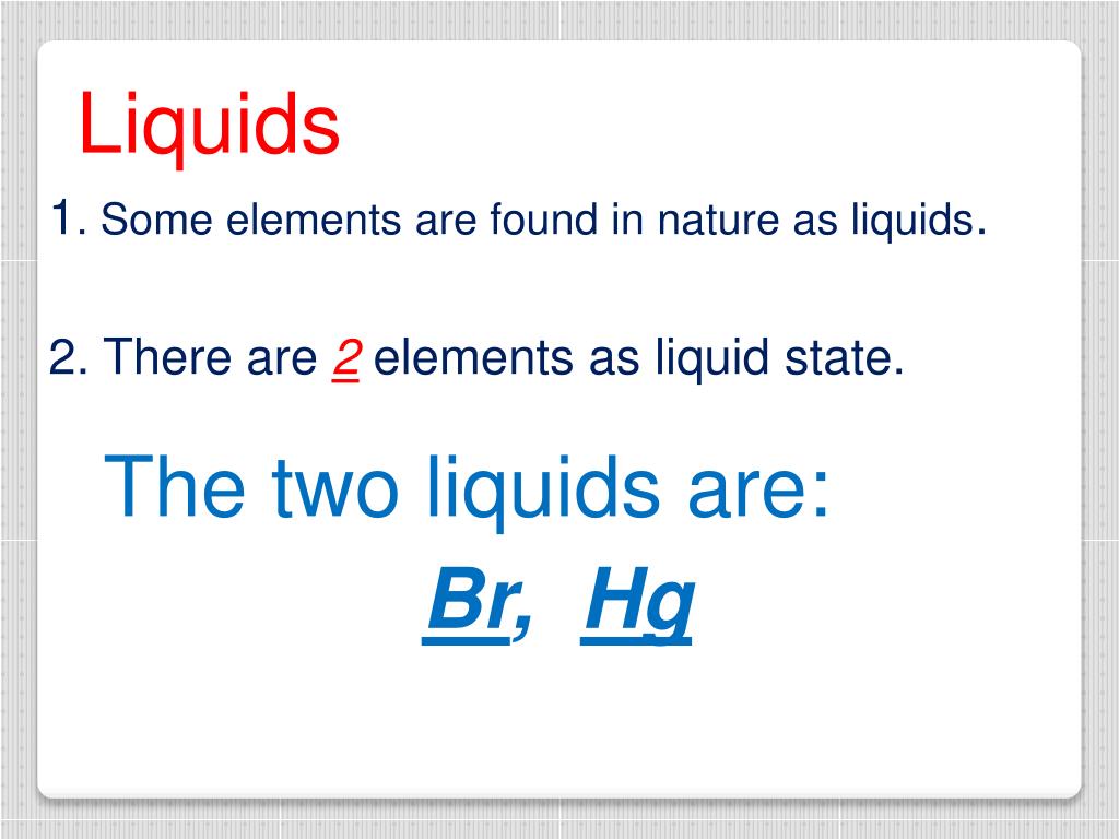 Liquids 1. Some elements are found in nature as liquids. 2. There are 2 elements as liquid state. The two liquids are: Br, Hg