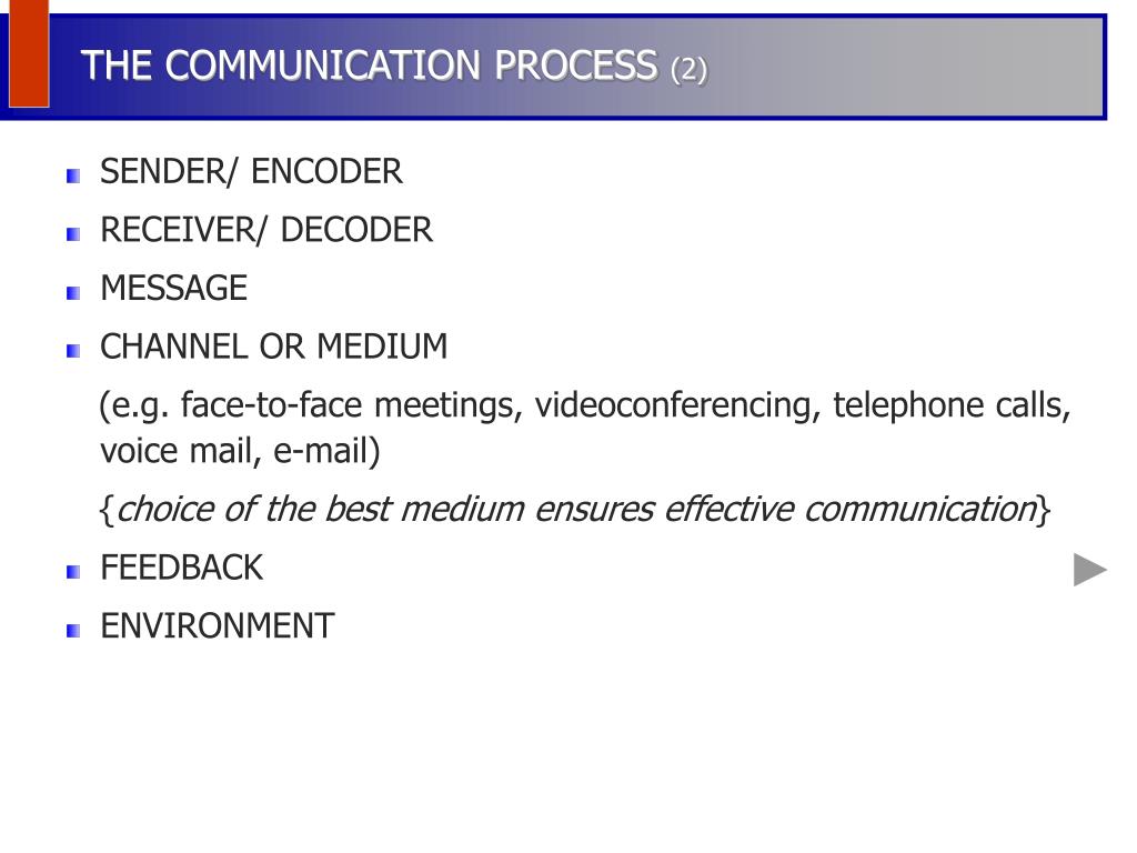 THE COMMUNICATION PROCESS (2) • SENDER/ ENCODER • RECEIVER/ DECODER • MESSAGE • CHANNEL OR MEDIUM (e.g. face-to-face meetings, videoconferencing, telephone calls, voice mail, e-mail) {choice of the best medium ensures effective communication} • FEEDBACK • ENVIRONMENT