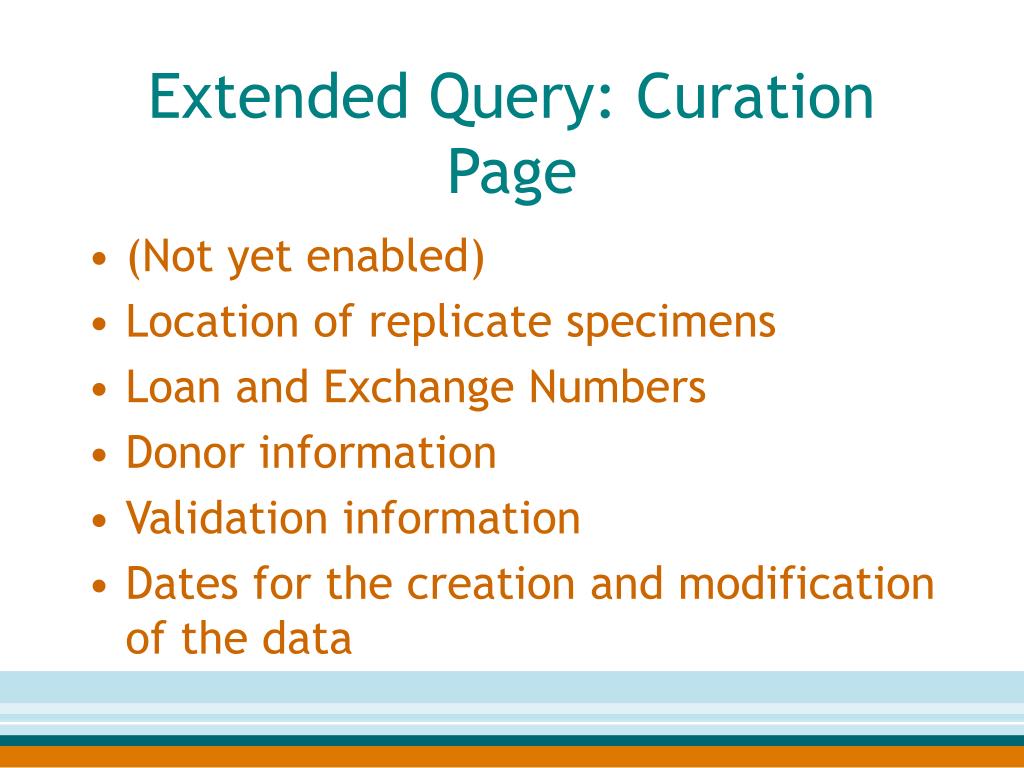Extended Query: Curation Page • (Not yet enabled) • Location of replicate specimens • Loan and Exchange Numbers • Donor information • Validation information • Dates for the creation and modification of the data