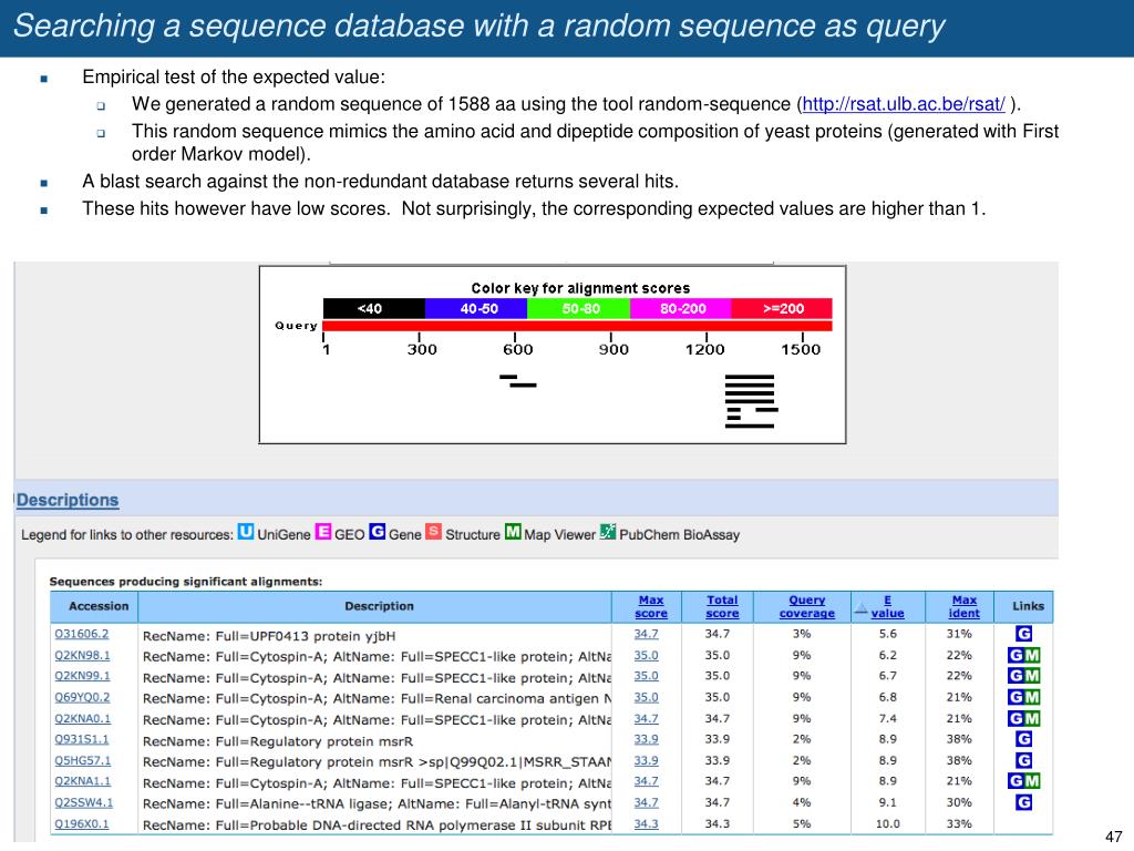 Searching a sequence database with a random sequence as query • Empirical test of the expected value: • We generated a random sequence of 1588 aa using the tool random-sequence (http://rsat.ulb.ac.be/rsat/ ). • This random sequence mimics the amino acid and dipeptide composition of yeast proteins (generated with First order Markov model). • A blast search against the non-redundant database returns several hits. • These hits however have low scores. Not surprisingly, the corresponding expected values are higher than 1.