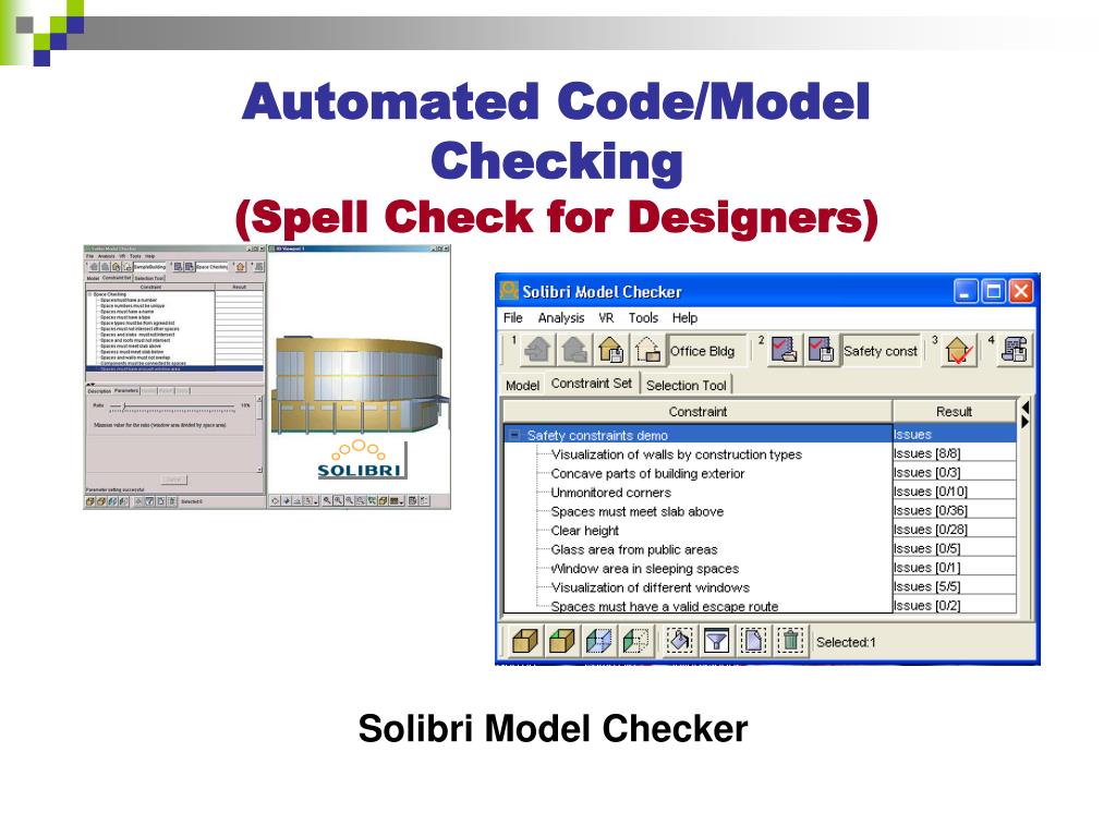 Automated Code/Model Checking(Spell Check for Designers) Solibri Model Checker