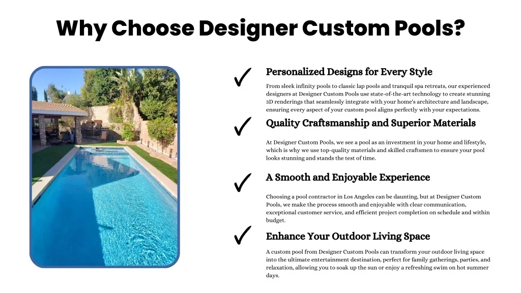 Why Choose Designer Custom Pools? Personalized Designs for Every Style From sleek infinity pools to classic lap pools and tranquil spa retreats, our experienced designers at Designer Custom Pools use state-of-the-art technology to create stunning 3D renderings that seamlessly integrate with your home's architecture and landscape, ensuring every aspect of your custom pool aligns perfectly with your expectations. Quality Craftsmanship and Superior Materials At Designer Custom Pools, we see a pool as an investment in your home and lifestyle, which is why we use top-quality materials and skilled craftsmen to ensure your pool looks stunning and stands the test of time. A Smooth and Enjoyable Experience Choosing a pool contractor in Los Angeles can be daunting, but at Designer Custom Pools, we make the process smooth and enjoyable with clear communication, exceptional customer service, and efficient project completion on schedule and within budget. Enhance Your Outdoor Living Space A custom pool from Designer Custom Pools can transform your outdoor living space into the ultimate entertainment destination, perfect for family gatherings, parties, and relaxation, allowing you to soak up the sun or enjoy a refreshing swim on hot summer days.