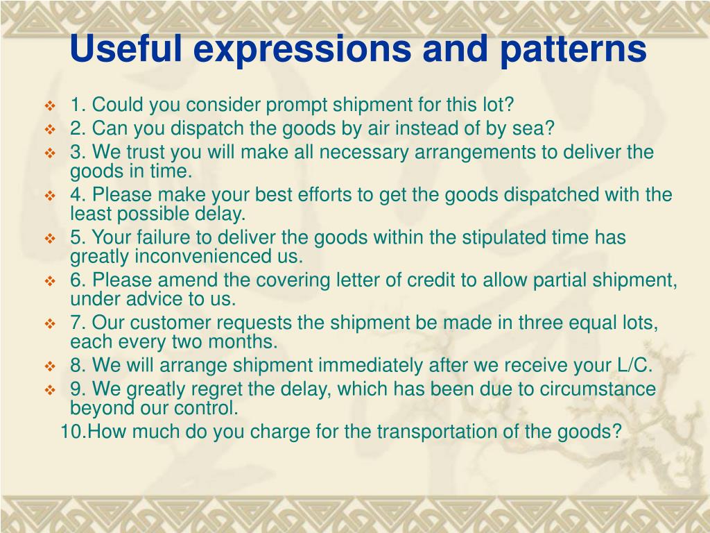 Useful expressions and patterns • 1. Could you consider prompt shipment for this lot? • 2. Can you dispatch the goods by air instead of by sea? • 3. We trust you will make all necessary arrangements to deliver the goods in time. • 4. Please make your best efforts to get the goods dispatched with the least possible delay. • 5. Your failure to deliver the goods within the stipulated time has greatly inconvenienced us. • 6. Please amend the covering letter of credit to allow partial shipment, under advice to us. • 7. Our customer requests the shipment be made in three equal lots, each every two months. • 8. We will arrange shipment immediately after we receive your L/C. • 9. We greatly regret the delay, which has been due to circumstance beyond our control. 10.How much do you charge for the transportation of the goods?