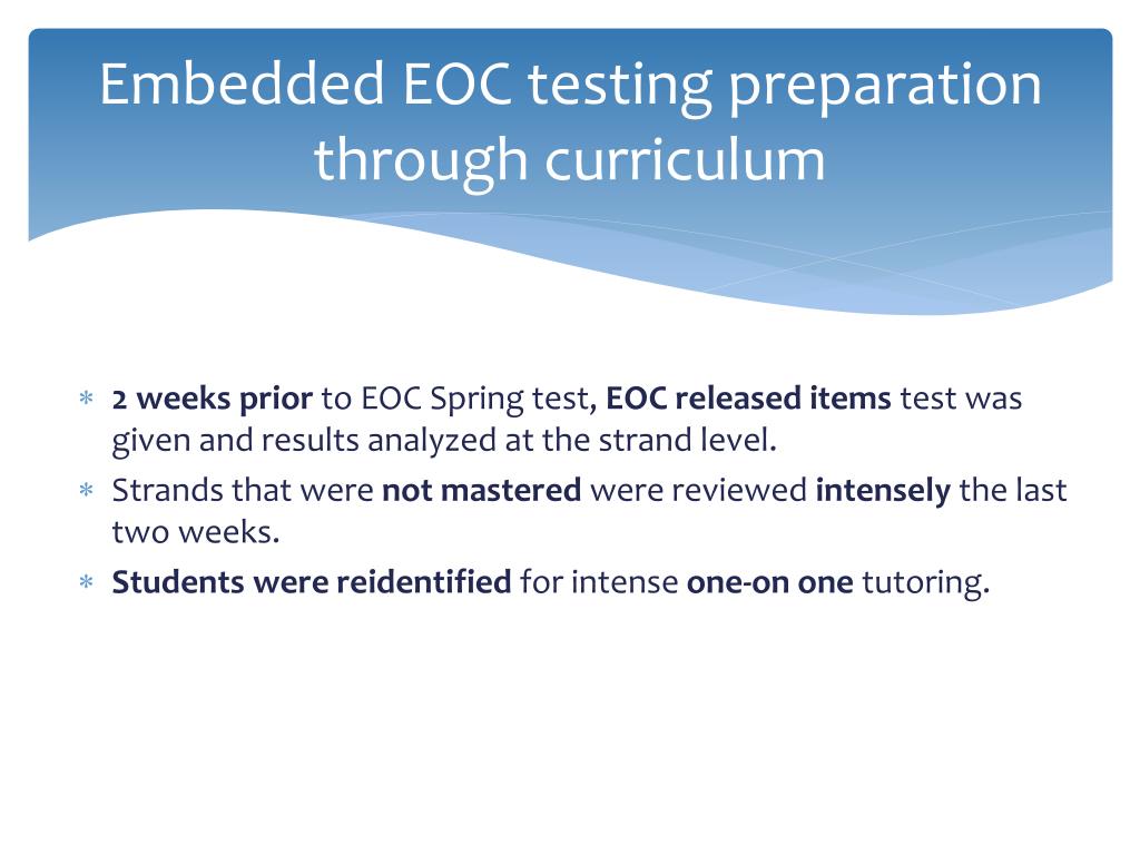 Embedded EOC testing preparation through curriculum • 2 weeks prior to EOC Spring test, EOC released items test was given and results analyzed at the strand level. • Strands that were not masteredwere reviewed intensely the last two weeks. • Students were reidentifiedfor intense one-on one tutoring.