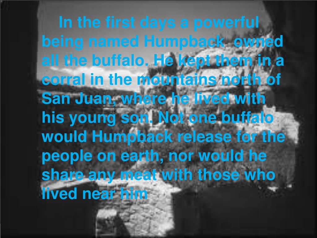 In the first days a powerful being named Humpback owned all the buffalo. He kept them in a corral in the mountains north of San Juan, where he lived with his young son. Not one buffalo would Humpback release for the people on earth, nor would he share any meat with those who lived near him