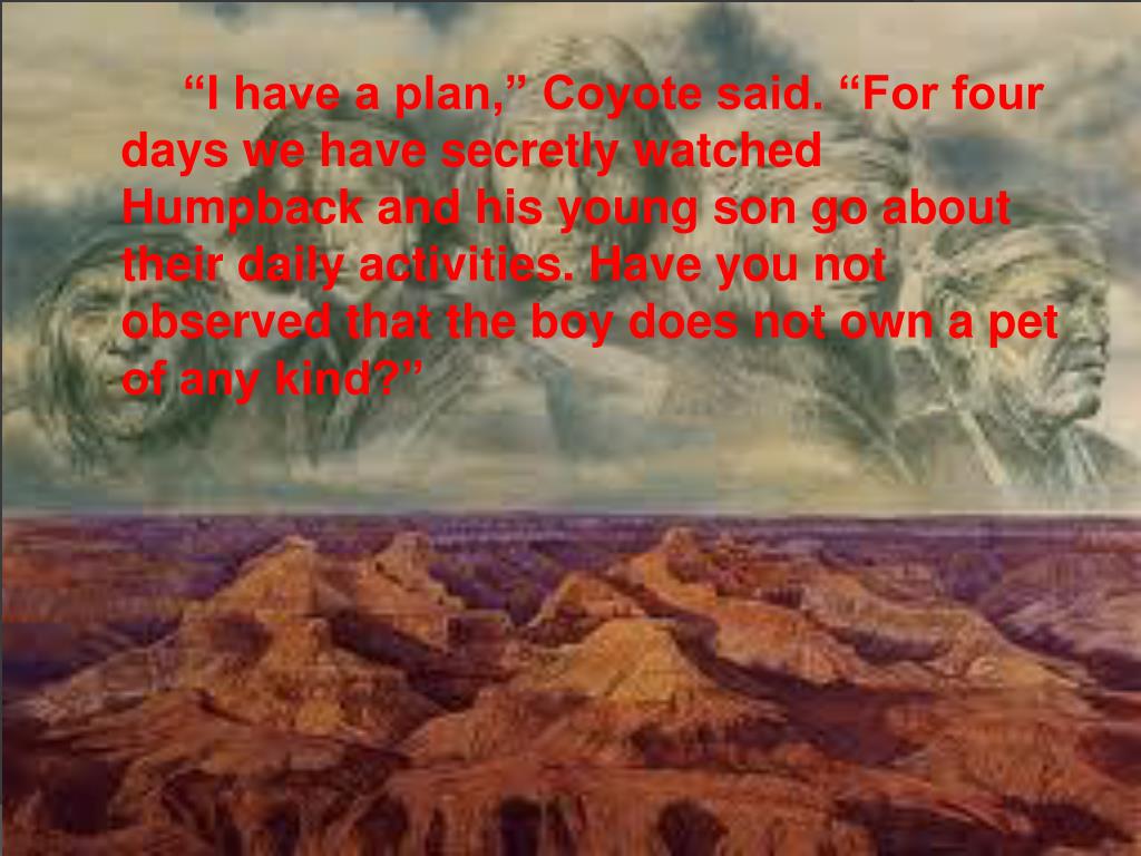 “I have a plan,” Coyote said. “For four days we have secretly watched Humpback and his young son go about their daily activities. Have you not observed that the boy does not own a pet of any kind?”