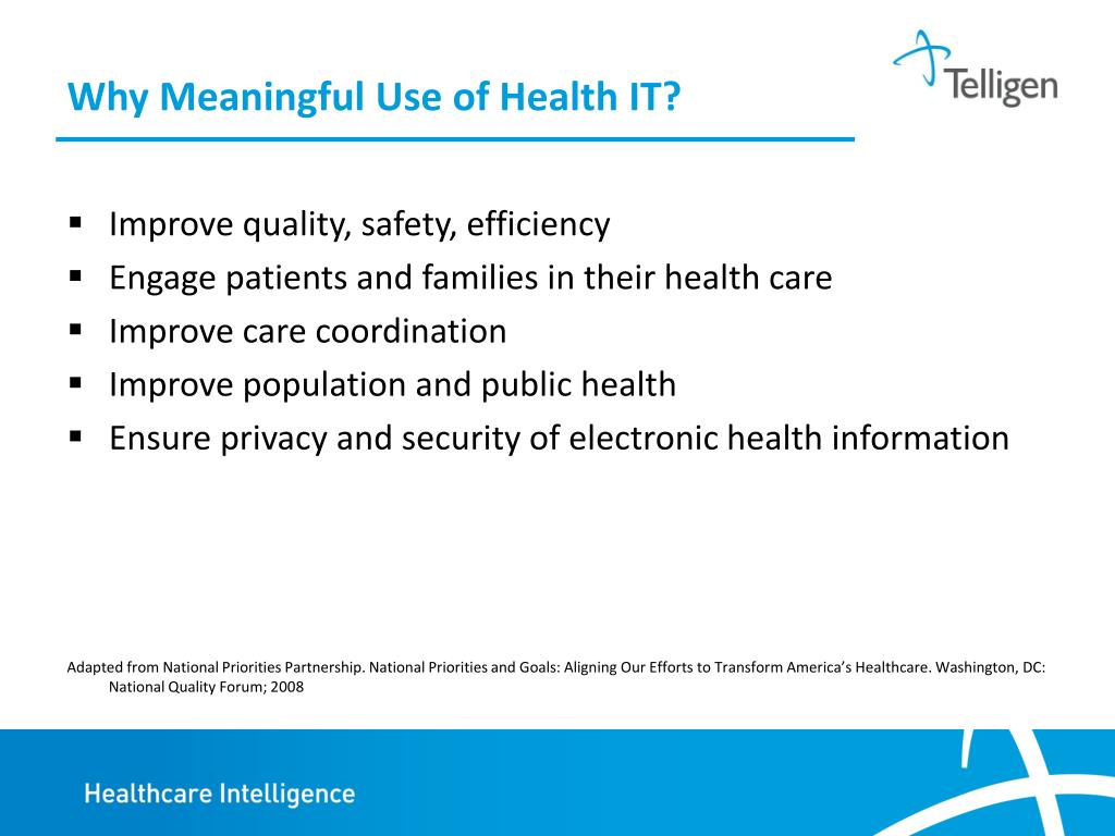 Why Meaningful Use of Health IT? • Improve quality, safety, efficiency • Engage patients and families in their health care • Improve care coordination • Improve population and public health • Ensure privacy and security of electronic health information Adapted from National Priorities Partnership. National Priorities and Goals: Aligning Our Efforts to Transform America’s Healthcare. Washington, DC: National Quality Forum; 2008