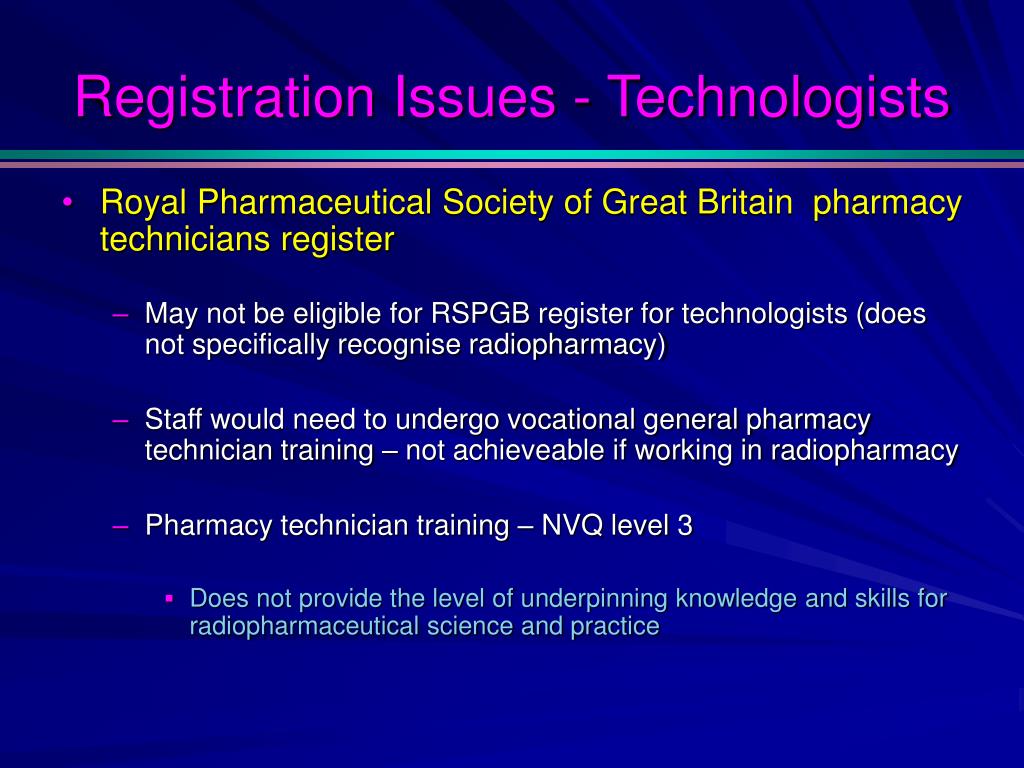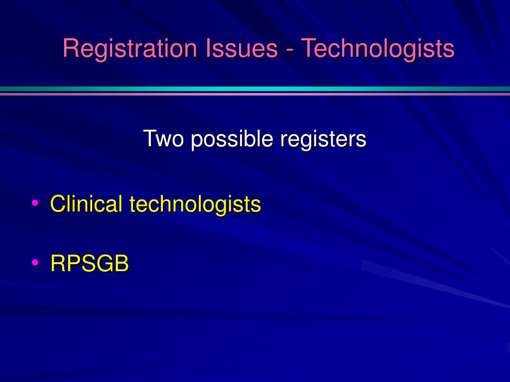 Registration Issues - Technologists Two possible registers • Clinical technologists • RPSGB