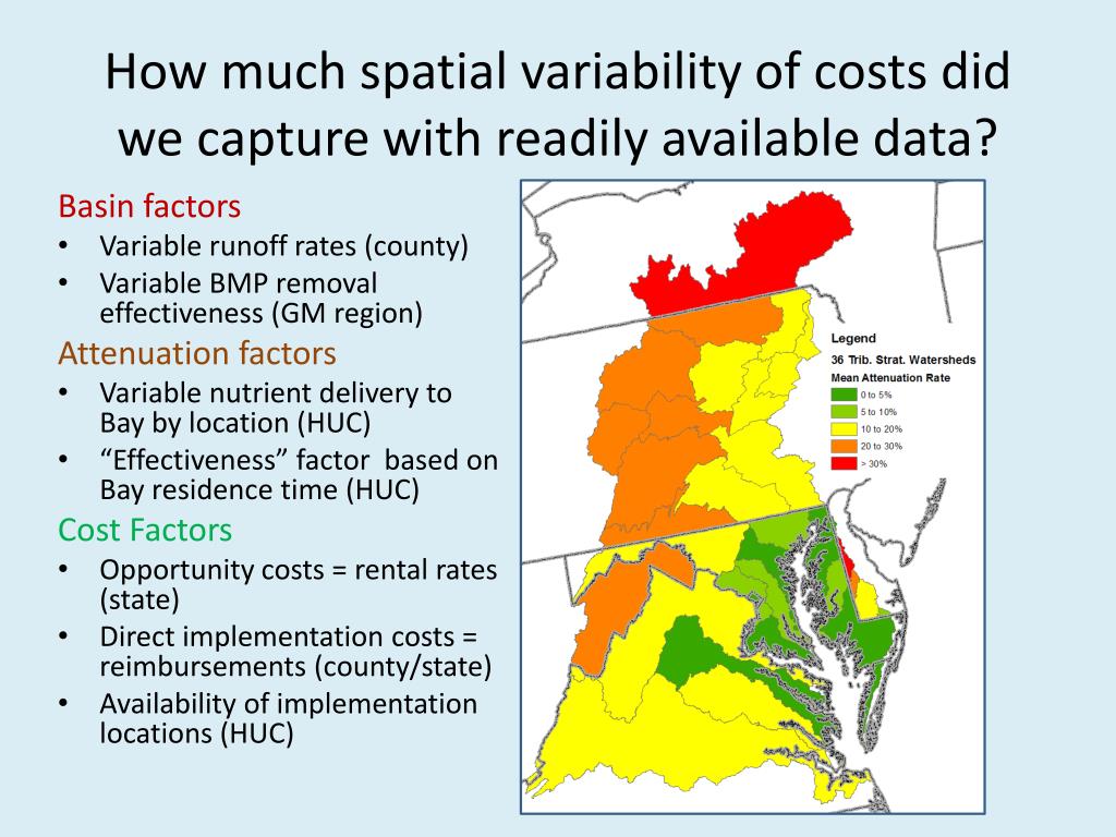 Basin factors Variable runoff rates (county) Variable BMP removal effectiveness (GM region) Attenuation factors Variable nutrient delivery to Bay by location (HUC) “Effectiveness” factor based on Bay residence time (HUC) Cost Factors Opportunity costs = rental rates (state) Direct implementation costs = reimbursements (county/state) Availability of implementation locations (HUC) How much spatial variability of costs did we capture with readily available data?