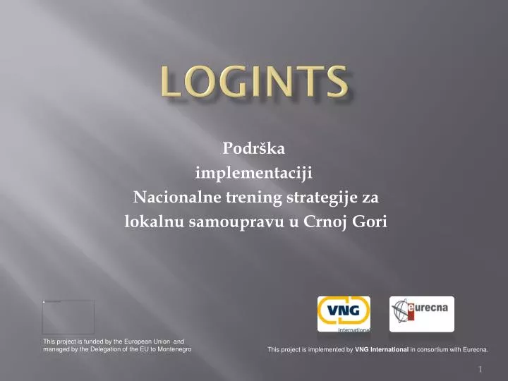 LOGINTS Podrška implementaciji Nacionalne trening strategije za lokalnu samoupravu u Crnoj Gori This project is funded by the European Union and managed by the Delegation of the EU to Montenegro This project is implemented by VNG International in consortium with Eurecna.