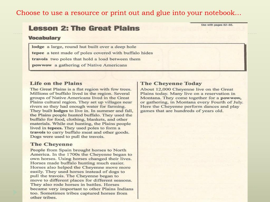 The Great PlainsChapter 2 Lesson 2 Notes How did the culture of the Great Plains people change after the horse was introduced from the Spanish? Native tribes included the Lakota (Sioux), Pawnee, Osage, & Cheyenne. The flat land of the Great Plains grew tall grass attracting buffalo. Plains people were both hunters and farmers growing corns, beans, and squash. They lived in both lodges (permanent) and teepees (mobile). Hunting roaming buffalorequired dogs and eventually horses to pull travois carrying buffalo resources including hides for clothing & blankets. Horses increased and made travel, hunting, and trading easier.