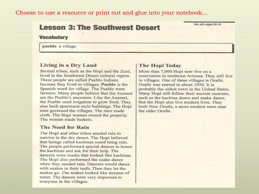 Lesson 3: The Southwest Desertp. 88-91 • Essential Question: How did the need for water affect the cultures developed by the people in the Southwest? • Vocabulary: • pueblo