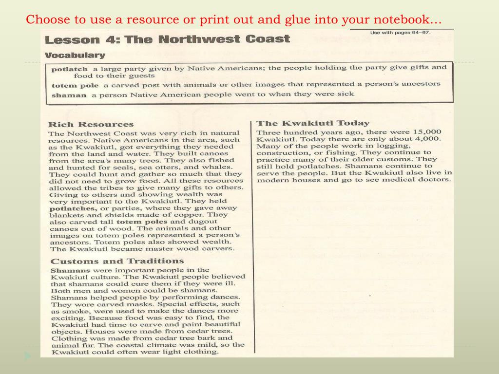 Lesson 4: The Northwest Coastp. 94-97 • Essential Question: How did the Native Americans of the Northwest Coast develop their cultures? • Vocabulary: • Potlatch- • Totem Pole- • Shaman-