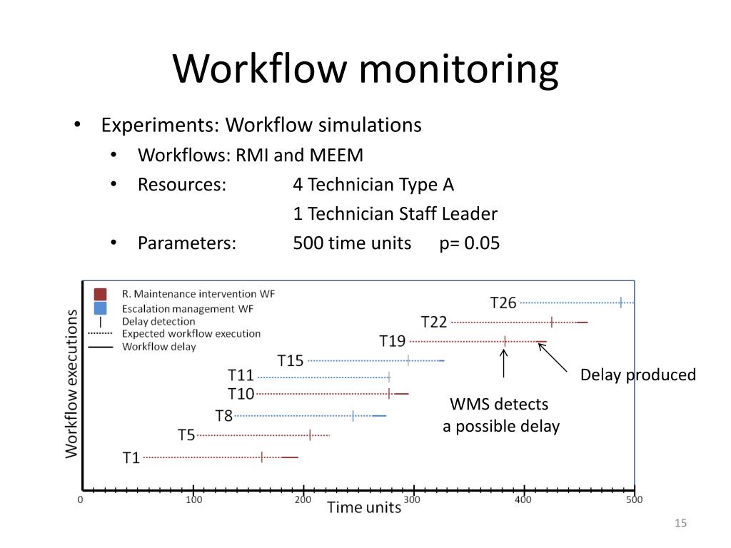 Workflow monitoring • Experiments: Workflow simulations • Workflows: RMI and MEEM • Resources: 4 Technician Type A • 1 Technician Staff Leader • Parameters: 500 time units p= 0.05 Delay produced WMS detects a possible delay