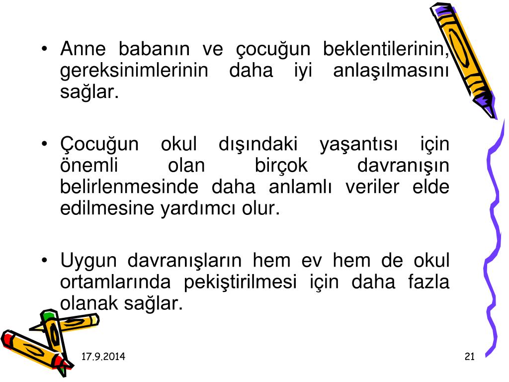 Anne babanın ve çocuğun beklentilerinin, gereksinimlerinin daha iyi anlaşılmasını sağlar. • Çocuğun okul dışındaki yaşantısı için önemli olan birçok davranışın belirlenmesinde daha anlamlı veriler elde edilmesine yardımcı olur. • Uygun davranışların hem ev hem de okul ortamlarında pekiştirilmesi için daha fazla olanak sağlar.