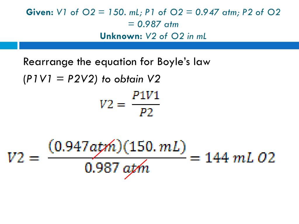 Given: V1 of O2 = 150. mL; P1 of O2 = 0.947 atm; P2 of O2 = 0.987 atmUnknown: V2 of O2 in mL Rearrange the equation for Boyle’s law (P1V1 = P2V2) to obtain V2