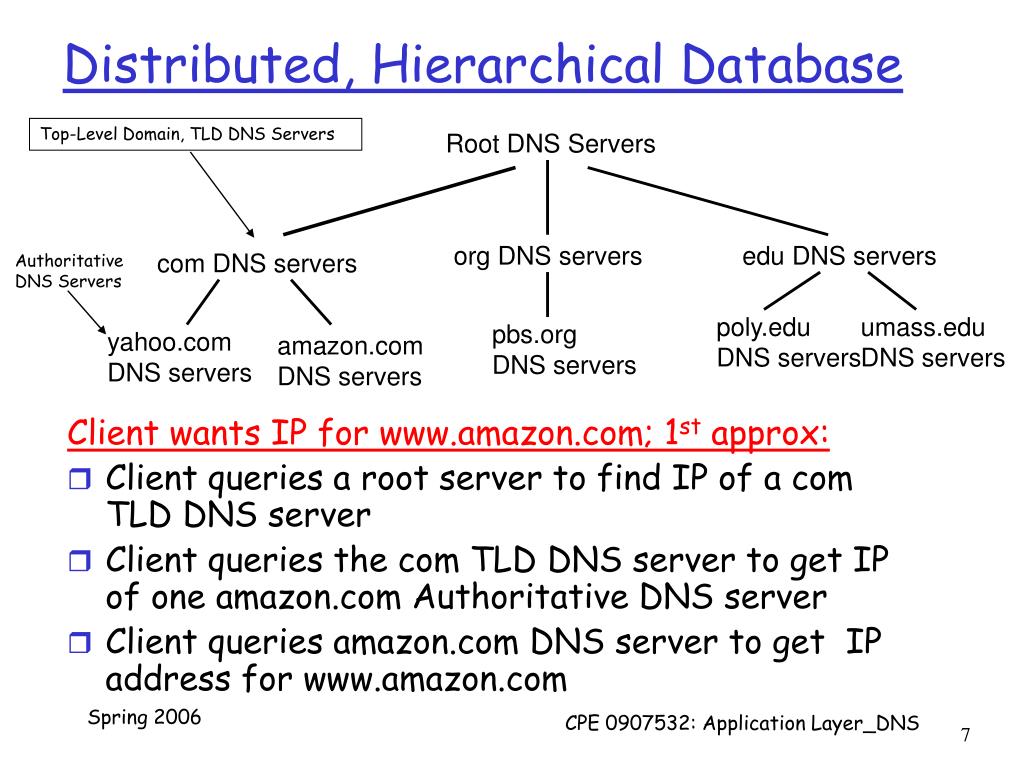 Root DNS Servers Top-Level Domain, TLD DNS Servers org DNS servers edu DNS servers com DNS servers Authoritative DNS Servers poly.edu DNS servers umass.edu DNS servers pbs.org DNS servers yahoo.com DNS servers amazon.com DNS servers Distributed, Hierarchical Database Client wants IP for www.amazon.com; 1st approx: • Client queries a root server to find IP of a com TLD DNS server • Client queries the com TLD DNS server to get IP of one amazon.com Authoritative DNS server • Client queries amazon.com DNS server to get IP address for www.amazon.com CPE 0907532: Application Layer_DNS