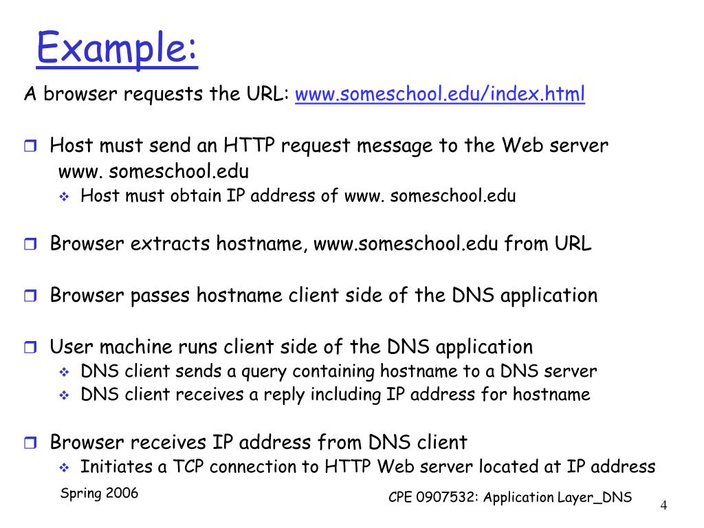Example: A browser requests the URL: www.someschool.edu/index.html • Host must send an HTTP request message to the Web server www. someschool.edu • Host must obtain IP address of www. someschool.edu • Browser extracts hostname, www.someschool.edu from URL • Browser passes hostname client side of the DNS application • User machine runs client side of the DNS application • DNS client sends a query containing hostname to a DNS server • DNS client receives a reply including IP address for hostname • Browser receives IP address from DNS client • Initiates a TCP connection to HTTP Web server located at IP address CPE 0907532: Application Layer_DNS