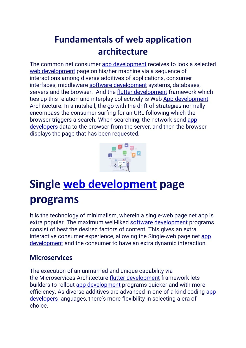 Fundamentals of web application architecture The common net consumer app development receives to look a selected web development page on his/her machine via a sequence of interactions among diverse additives of applications, consumer interfaces, middleware software development systems, databases, servers and the browser. And the flutter development framework which ties up this relation and interplay collectively is Web App development Architecture. In a nutshell, the go with the drift of strategies normally encompass the consumer surfing for an URL following which the browser triggers a search. When searching, the network send app developers data to the browser from the server, and then the browser displays the page that has been requested. Single web development page programs It is the technology of minimalism, wherein a single-web page net app is extra popular. The maximum well-liked software development programs consist of best the desired factors of content. This gives an extra interactive consumer experience, allowing the Single-web page net app development and the consumer to have an extra dynamic interaction. Microservices The execution of an unmarried and unique capability via the Microservices Architecture flutter development framework lets builders to rollout app development programs quicker and with more efficiency. As diverse additives are advanced in one-of-a-kind coding app developers languages, there’s more flexibility in selecting a era of choice.