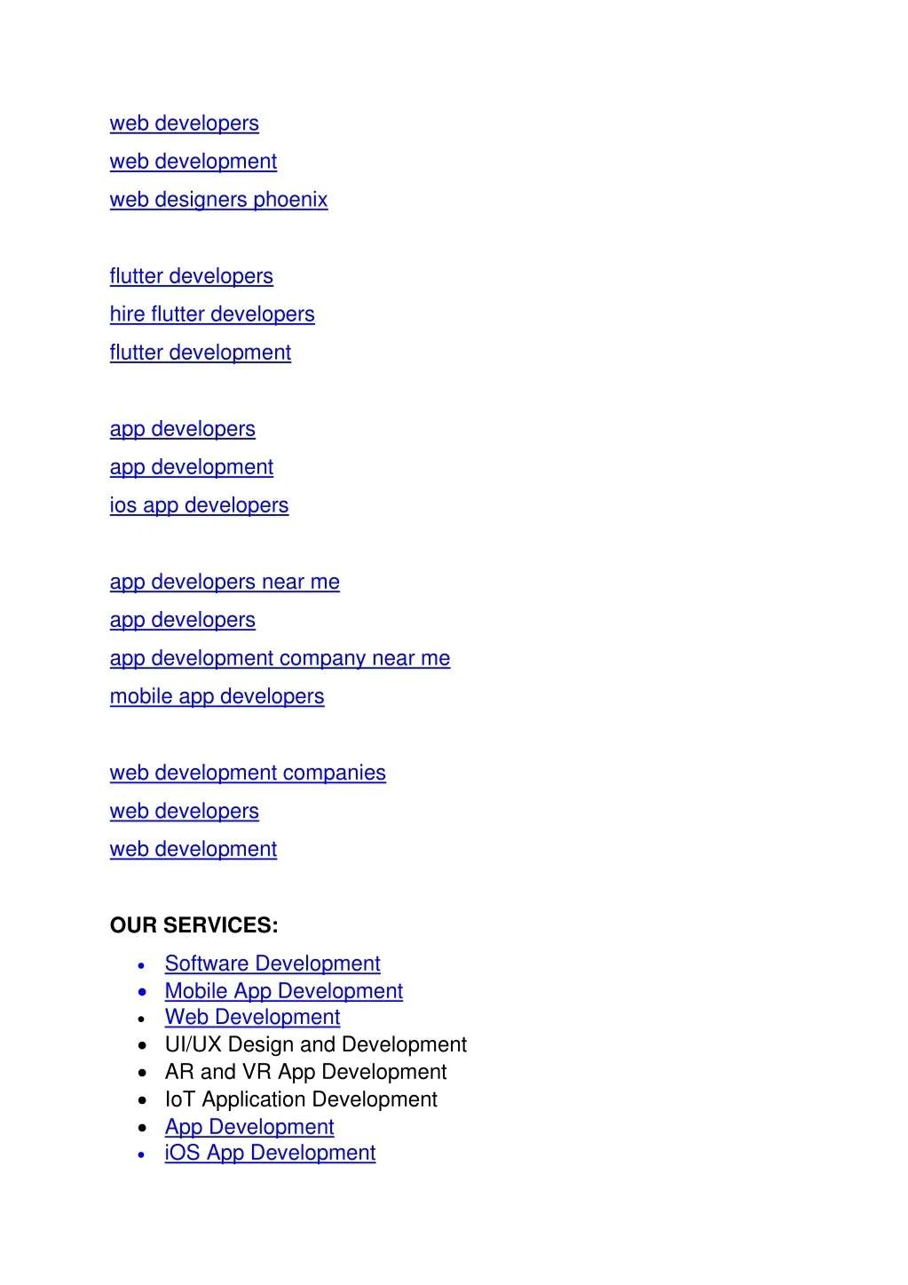web developers web development web designers phoenix flutter developers hire flutter developers flutter development app developers app development ios app developers app developers near me app developers app development company near me mobile app developers web development companies web developers web development OUR SERVICES: •Software Development • Mobile App Development •Web Development • UI/UX Design and Development • AR and VR App Development • IoT Application Development • App Development •iOS App Development