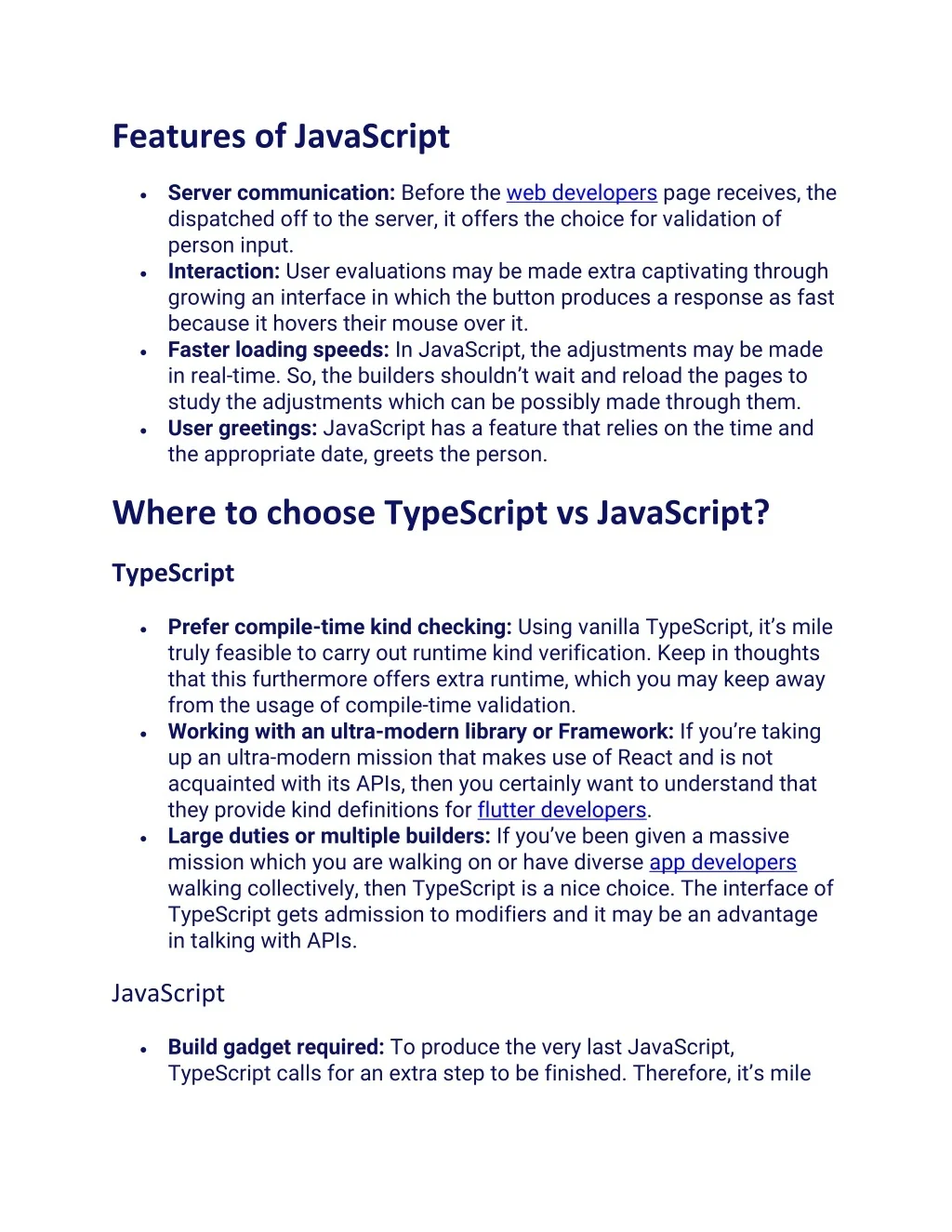 Features of JavaScript •Server communication: Before the web developers page receives, the dispatched off to the server, it offers the choice for validation of person input. •Interaction: User evaluations may be made extra captivating through growing an interface in which the button produces a response as fast because it hovers their mouse over it. •Faster loading speeds: In JavaScript, the adjustments may be made in real-time. So, the builders shouldn’t wait and reload the pages to study the adjustments which can be possibly made through them. •User greetings: JavaScript has a feature that relies on the time and the appropriate date, greets the person. Where to choose TypeScript vs JavaScript? TypeScript •Prefer compile-time kind checking:Using vanilla TypeScript, it’s mile truly feasible to carry out runtime kind verification. Keep in thoughts that this furthermore offers extra runtime, which you may keep away from the usage of compile-time validation. •Working with an ultra-modern library or Framework:If you’re taking up an ultra-modern mission that makes use of React and is not acquainted with its APIs, then you certainly want to understand that they provide kind definitions for flutter developers. •Large duties or multiple builders:If you’ve been given a massive mission which you are walking on or have diverse app developers walking collectively, then TypeScript is a nice choice. The interface of TypeScript gets admission to modifiers and it may be an advantage in talking with APIs. JavaScript •Build gadget required: To produce the very last JavaScript, TypeScript calls for an extra step to be finished. Therefore, it’s mile