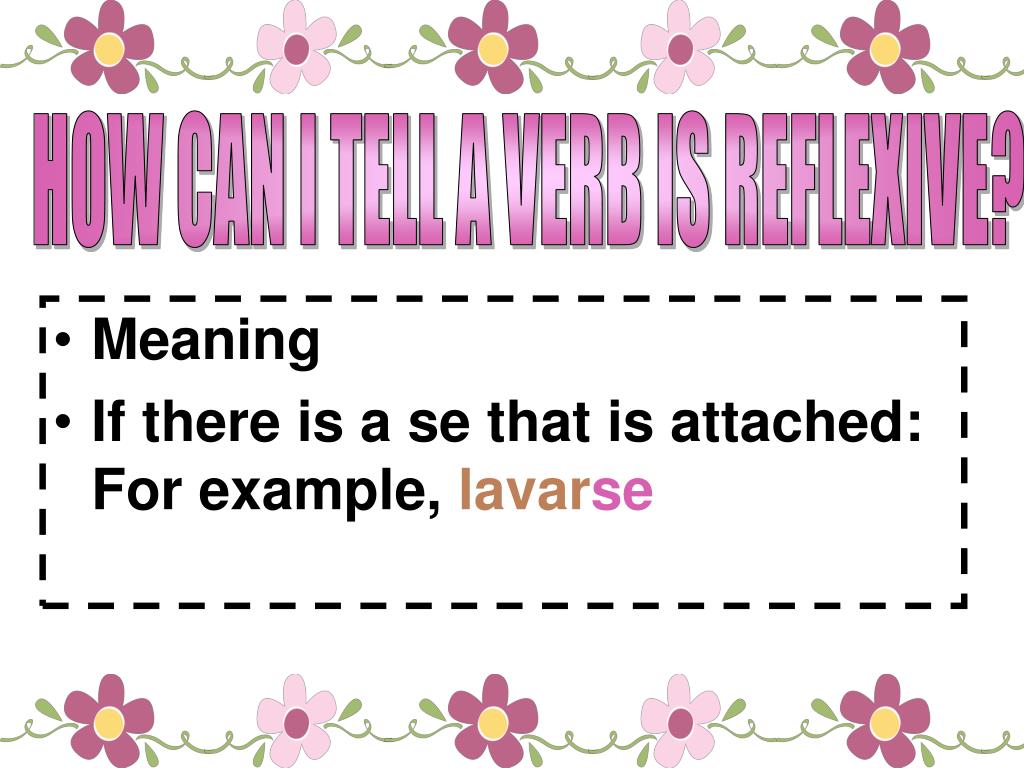 HOW CAN I TELL A VERB IS REFLEXIVE? • Meaning • If there is a se that is attached: For example, lavarse