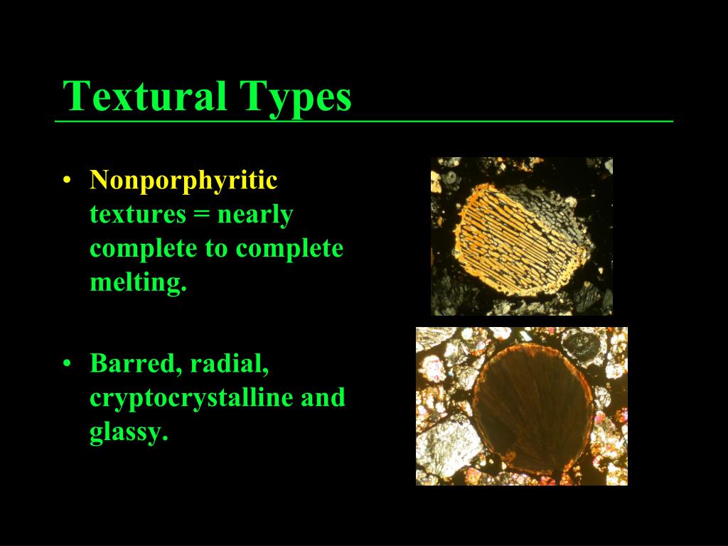Textural Types • Nonporphyritic textures = nearly complete to complete melting. • Barred, radial, cryptocrystalline and glassy.